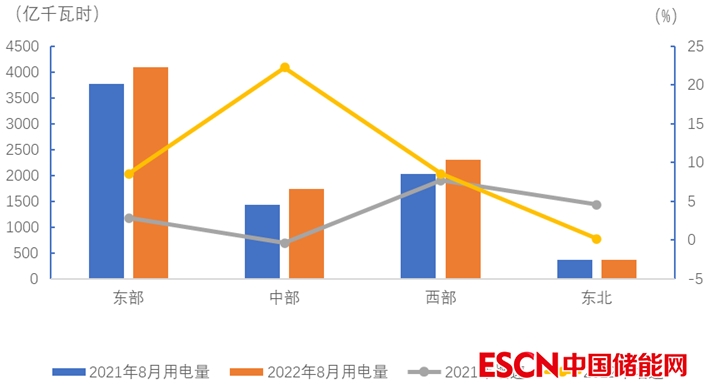 8月份,東、中、西部和東北地區(qū)全社會用電量增速分別為8.6%、22.3%、8.6%和0.2%。
