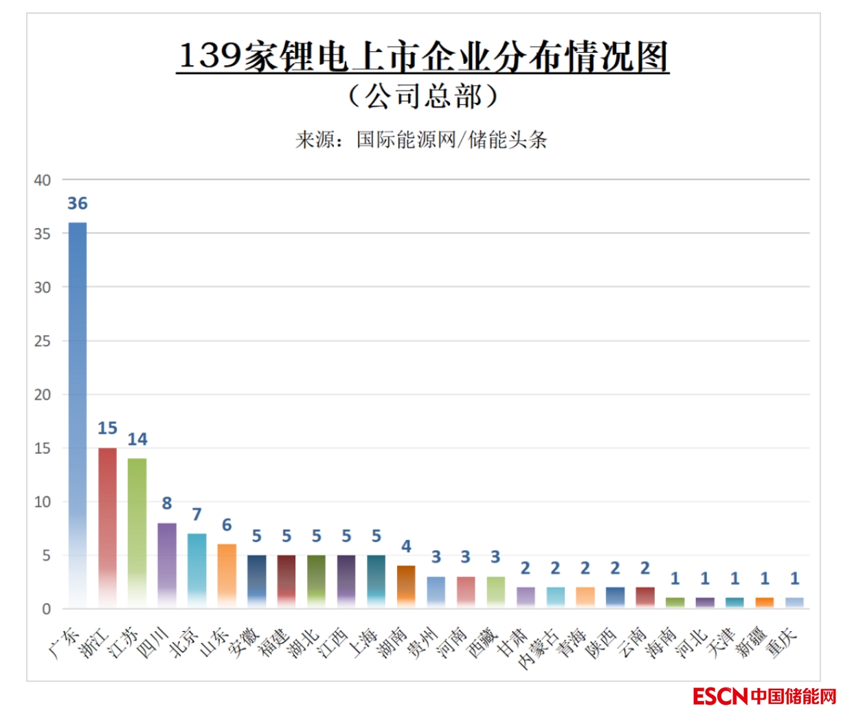 國際能源網(wǎng)/儲能頭條(微信號:chuneng365)梳理126只市值過百億的鋰電池概念股的總部所在地。從省份分布來看,廣東是中國鋰電第一大省,有36家市值百億的鋰電池上市公司,占了全國總數(shù)的28%;民營經(jīng)濟最發(fā)達(dá)的浙江也不負(fù)眾望,擁有15家鋰電池上市企業(yè)。