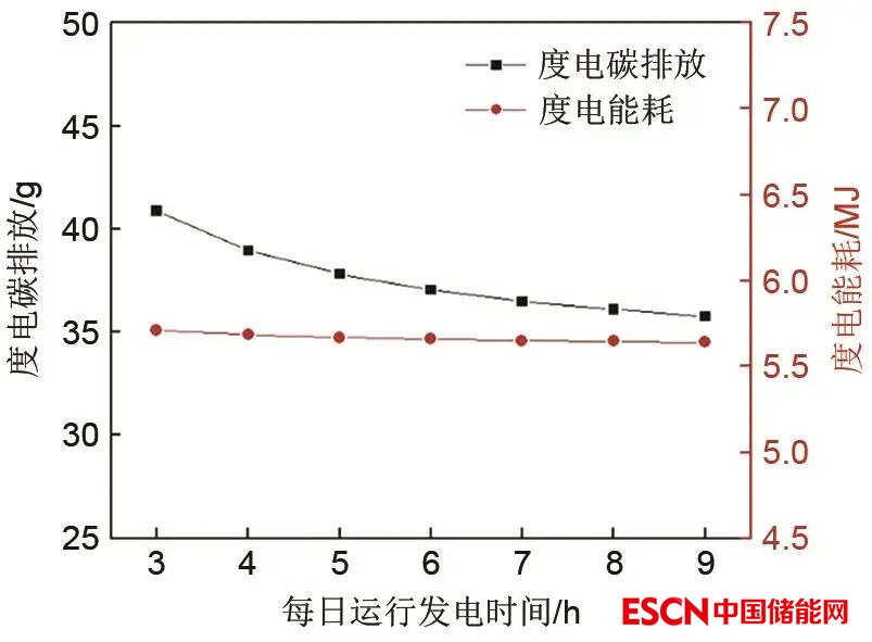 發(fā)電時間主要影響系統(tǒng)的生命周期總耗電量和發(fā)電量,從而對能耗和二氧化碳排放產(chǎn)生影響。圖11為系統(tǒng)的日運行發(fā)電時間對全生命周期性能的影響,當其他因素不變情況下,系統(tǒng)日運行發(fā)電時間每增加1 h,其度電能耗增加0.012 MJ,度電二氧化碳排放增加0.85 g,可見,發(fā)電時間對系統(tǒng)生命周期能耗的影響很小,而對生命周期二氧化碳排放影響較大。