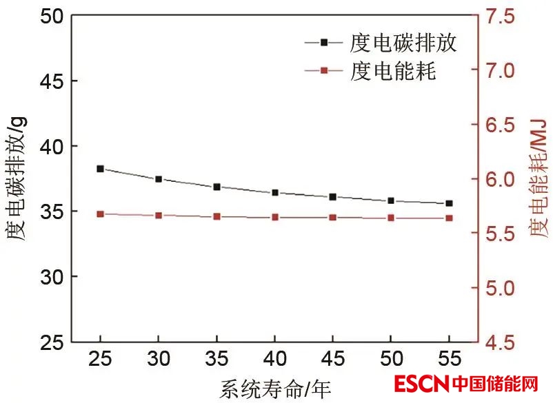 對于大規(guī)模儲能技術來說,提高系統(tǒng)壽命對于發(fā)揮其優(yōu)勢意義重大,而系統(tǒng)工作壽命也是影響全生命周期能耗及二氧化碳排放的關鍵因素。為了定量研究其對能耗和二氧化碳排放的影響,保持其他因素不變,僅改變機組的工作壽命,敏感性分析結果如圖10所示。系統(tǒng)壽命每增加1年,度電能耗減少0.001 MJ,度電二氧化碳排放減少約0.089 g。由此可見,系統(tǒng)壽命是影響系統(tǒng)二氧化碳排放的關鍵因素。