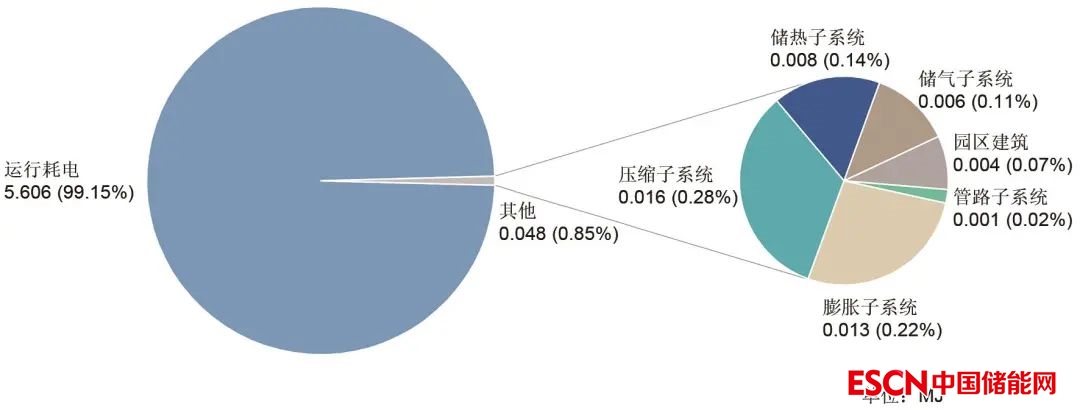 10 MW先進CAES系統(tǒng)每發(fā)電1 kWh需要消耗能量為5.653 MJ,由此可通過計算得到該系統(tǒng)的全生命周期凈能量效率為63.68%。其中,運行階段輸入的儲能電量5.606 MJ,占總耗能的99.16%;其余部分為系統(tǒng)在生產(chǎn)、建造和廢棄階段的耗能,總計0.047 MJ,占0.83%。除運行階段的耗能外,將系統(tǒng)其他階段的耗能按不同子系統(tǒng)進行劃分,結果如圖5所示。其中,壓縮子系統(tǒng)和膨脹子系統(tǒng)的耗能是最多的,分別為0.016 MJ和0.013 MJ,分別占總耗能的0.29%和0.22%;儲熱子系統(tǒng)和儲氣子系統(tǒng)的耗能分別為0.008 MJ和0.006 MJ,占總耗能的0.14%和0.10%;管路系統(tǒng)及園區(qū)建設部分的耗能在總能耗中占比較小,總計0.08%。