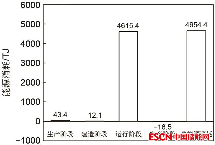 利用本研究的全生命周期分析方法和模型,通過對本工作中的10 MW先進CAES系統(tǒng)的全生命周期過程分析計算可得,10 MW先進CAES系統(tǒng)全生命周期能源消耗為4654.4 TJ,系統(tǒng)分階段能源消耗如圖4所示。其中,運行階段消耗能量4615.4 TJ,占比最大,達99.16%;生產(chǎn)階段為43.4 TJ,占比0.93%;建造階段為12.1 TJ,占比0.26%;廢棄處置階段為-16.5 TJ,占-0.36%。從計算結果可以看出,系統(tǒng)運行階段占據(jù)絕大多數(shù)能量消耗,廢棄階段回收能源為生產(chǎn)與建設階段能源消耗的1/3。