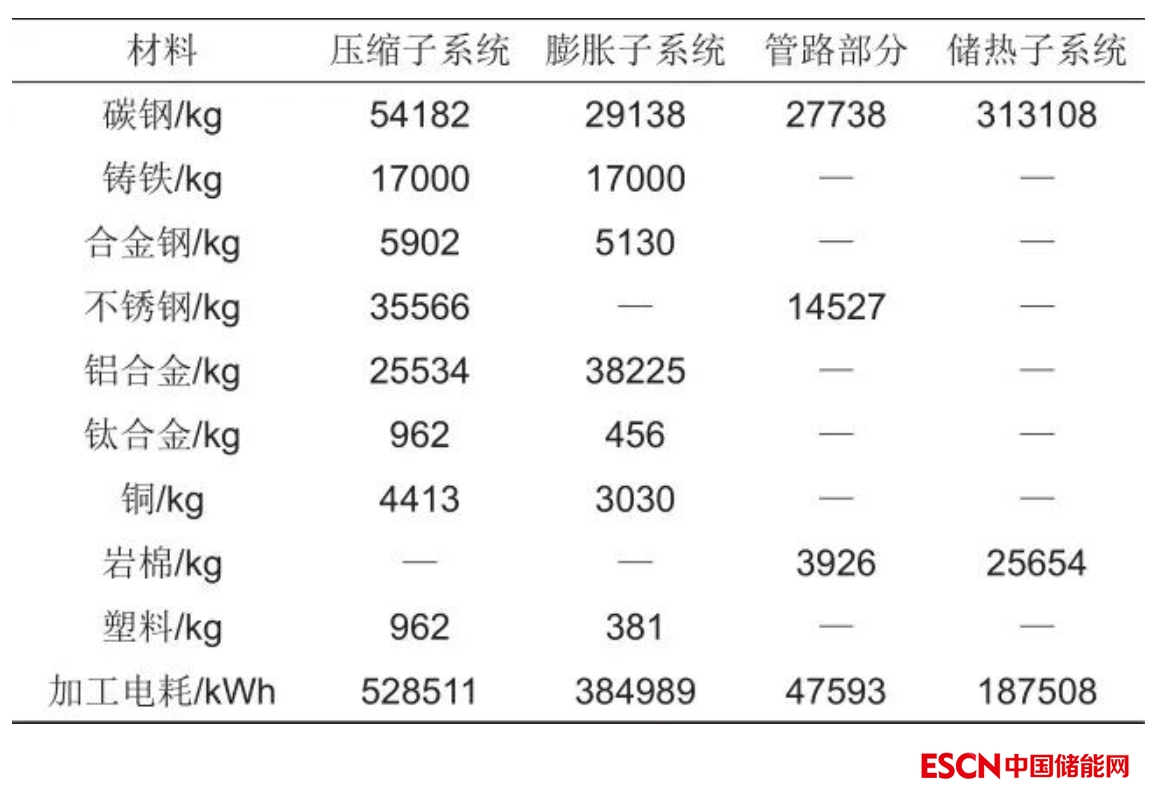 生產(chǎn)階段主要涵蓋范圍為10 MW先進CAES系統(tǒng)所需壓縮子系統(tǒng)、膨脹子系統(tǒng)、儲熱子系統(tǒng)及管路中各種部件、閥門、管道等的原材料獲取、運輸、生產(chǎn)和加工等過程。儲氣部分采用的是鹽穴儲氣,因此這一部分放在建造階段討論?;趯δ?0 MW先進CAES示范電站、相關文獻和數(shù)據(jù)庫的調(diào)研分析,本研究獲取了10 MW先進CAES系統(tǒng)的主要組成部分的耗材及耗能,具體如表2所示。