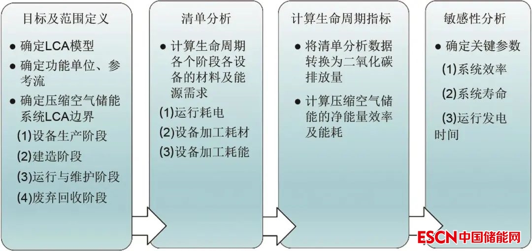 生命周期評價(life cycle assessment,LCA),是指對一個產(chǎn)品系統(tǒng)的生命周期中輸入、輸出及其潛在環(huán)境影響的匯編和評價。生命周期評價是一種重要的環(huán)境管理工具,可用于評估產(chǎn)品或系統(tǒng)整個生命周期階段的環(huán)境影響。本工作使用生命周期評價的方法,分析壓縮空氣儲能系統(tǒng)的生命周期能耗及二氧化碳排放量。根據(jù)國際標準ISO14040,生命周期評價方法包括目的及范圍確定、清單分析、影響評估和解釋說明4個階段。本工作在生命周期評價方法的基礎上,建立研究方法模型,具體研究方法及過程如圖1所示。