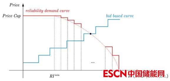 (1)可靠性容量市場:市場組織者根據(jù)未來西北區(qū)域可靠性要求構(gòu)建可靠性需求曲線,曲線形狀如圖9中紅線所示;根據(jù)各機組上報容量與價格,形成可靠性容量報價曲線,如圖中藍線所示。市場組織者組織容量市場統(tǒng)一拍賣,集中出清,以報價曲線與可靠性容量需求曲線的交點為可靠性容量市場均衡點,并以此為邊際價格進行結(jié)算。