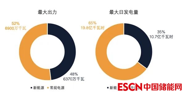 2021年,除裝機規(guī)模外,西北新能源發(fā)電量與峰值出力也同步提升。如圖2、圖3所示,發(fā)電量方面,全年達2276.2億千瓦時,同比增長34.5%;占總發(fā)電量的21.18%,已超過歐盟同期水平。峰值出力方面,截至2022年3月,單日發(fā)電量最大值突破10億千瓦時,達10.7億千瓦時,最大占比35.1%;最大出力6370萬千瓦,占比48.0%。