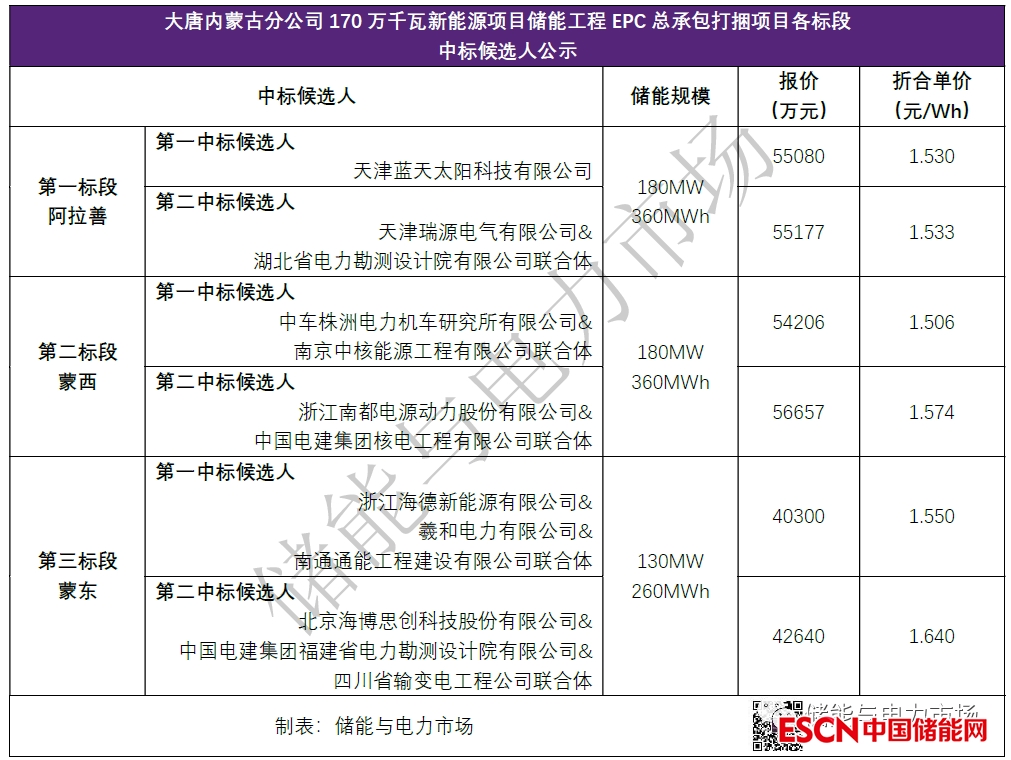 結(jié)合此前發(fā)布的蒙東標段結(jié)果,至此490MW/960MWh儲能EPC集采全部完成,三個標段中標候選人的報價區(qū)間在1.506~1.640元/Wh之間。