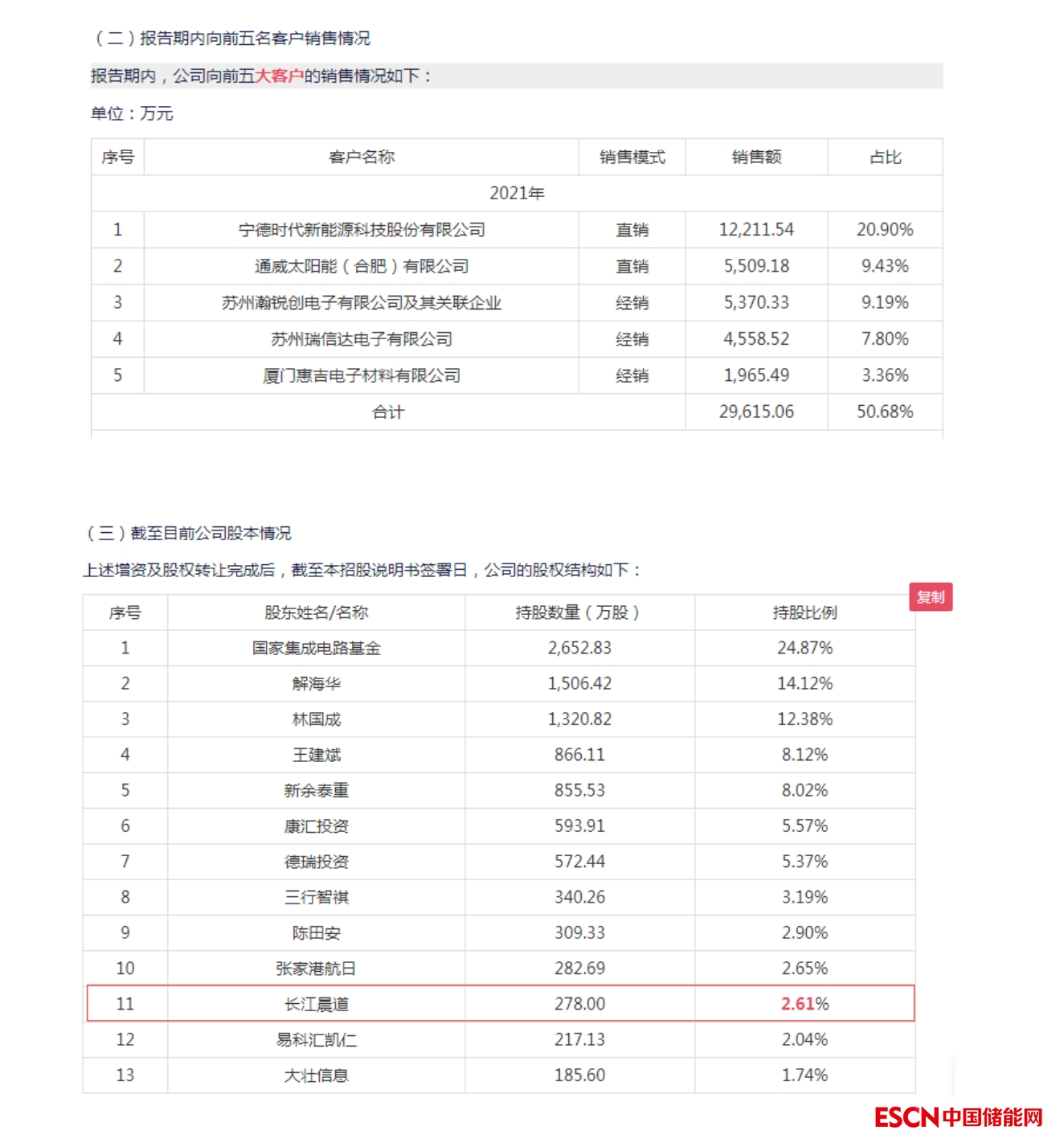 德邦科技2021年第一大客戶便是寧德時(shí)代,德邦科技對(duì)其銷售額占營(yíng)收的20.90%。截至招股書(shū)簽署日,長(zhǎng)江晨道為德邦科技第十一大股東,持股比例為2.61%。
