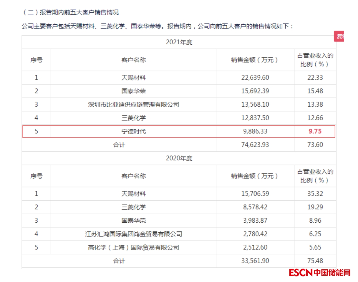 而寧德時(shí)代,正是華盛鋰電的大客戶。2021年,寧德時(shí)代為其第五大客戶,銷售收入占比達(dá)9.75%。