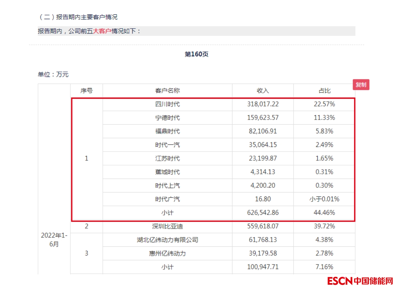據(jù)湖南裕能招股書(shū)(注冊(cè)稿)顯示,2022年1~6月,其第一大客戶當(dāng)屬寧德時(shí)代。當(dāng)期,湖南裕能對(duì)寧德時(shí)代銷售收入為62.65億元,占總收入比例高達(dá)44.46%。