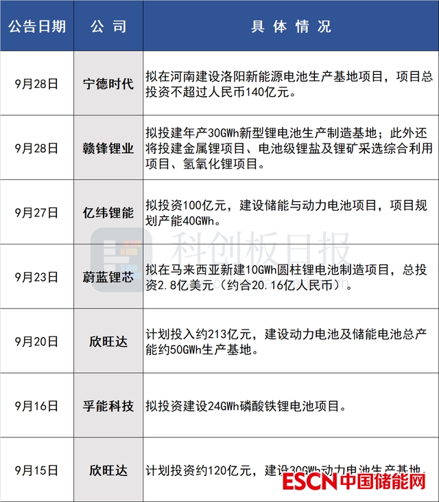 據(jù)《科創(chuàng)板日報》不完全統(tǒng)計,近半個月以來,寧德時代、贛鋒鋰業(yè)、億緯鋰能、蔚藍(lán)鋰芯、欣旺達(dá)、孚能科技6家鋰電池公司已宣告大手筆擴產(chǎn)計劃,且多數(shù)為百億級別項目: