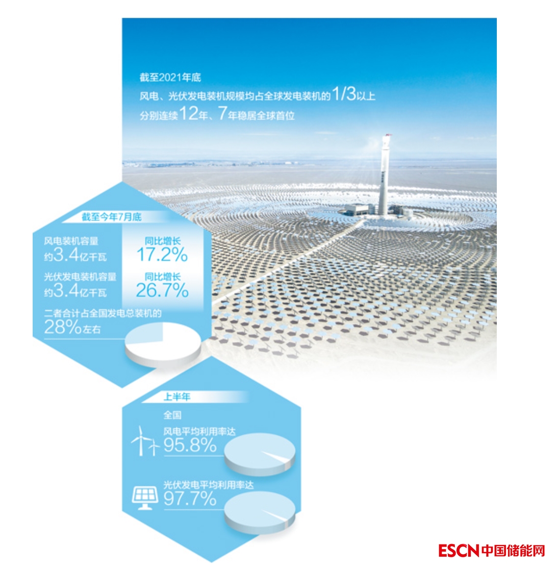 今年以來,我國新能源裝機規(guī)模穩(wěn)步擴大。截至7月底,風(fēng)電裝機容量約3.4億千瓦,同比增長17.2%;光伏發(fā)電裝機容量約3.4億千瓦,同比增長26.7%;二者合計占全國發(fā)電總裝機的28%左右。同時,新能源消納利用水平不斷提升。上半年,全國風(fēng)電、光伏發(fā)電平均利用率分別達到95.8%、97.7%,12個省份“風(fēng)光”利用率達到100%。