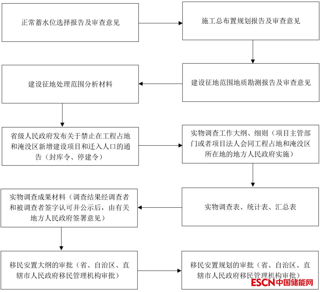 “先移民后建設(shè)”是抽水蓄能電站開發(fā)的重要方針,移民安置規(guī)劃編制完成后,由省、自治區(qū)、直轄市人民政府移民管理機構(gòu)審核,抽水蓄能項目業(yè)主取得移民安置規(guī)劃審批文件是后續(xù)辦理項目核準手續(xù)及用地手續(xù)的前置性條件。抽水蓄能電站在取得移民安置規(guī)劃審批文件前的主要工作流程如下: