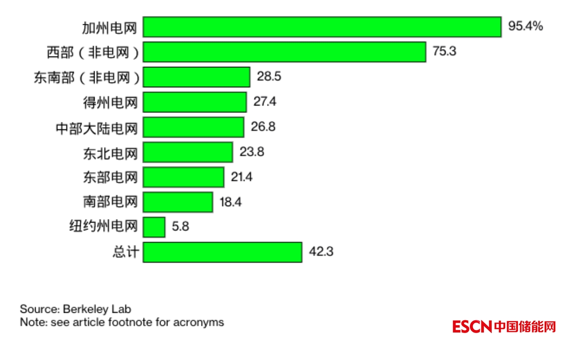 在加利福尼亞,42% 的新建風(fēng)力發(fā)電項目包括電池儲能——而在德克薩斯州,27% 的燃氣發(fā)電也包括電池儲能。電池儲能范圍在持續(xù)擴大,在勞倫斯伯克利國家實驗室的下一份報告中我們會繼續(xù)關(guān)注。?