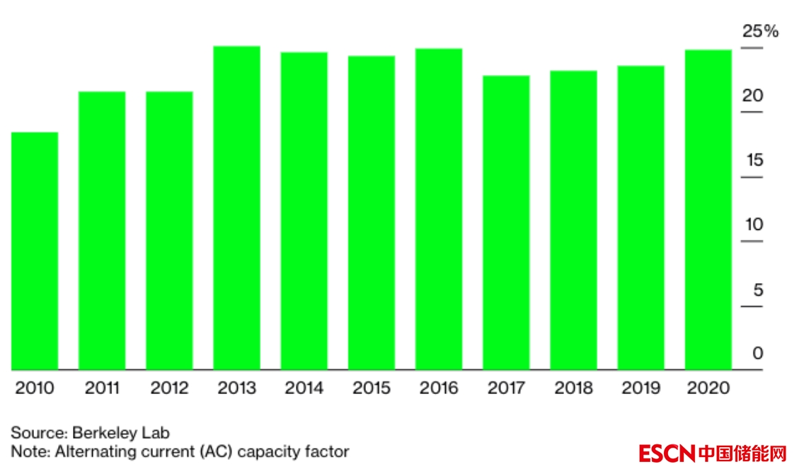 圖4. 美國電網(wǎng)側(cè)太陽能容量系數(shù),按項目投運的年份統(tǒng)計。圖片來源:勞倫斯伯克利國家實驗室