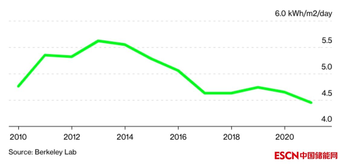 圖3. 美國電網(wǎng)側(cè)光伏項目長期“平均全球水平輻照度 GHI”,按項目投運的年份統(tǒng)計。圖片來源:勞倫斯伯克利國家實驗室