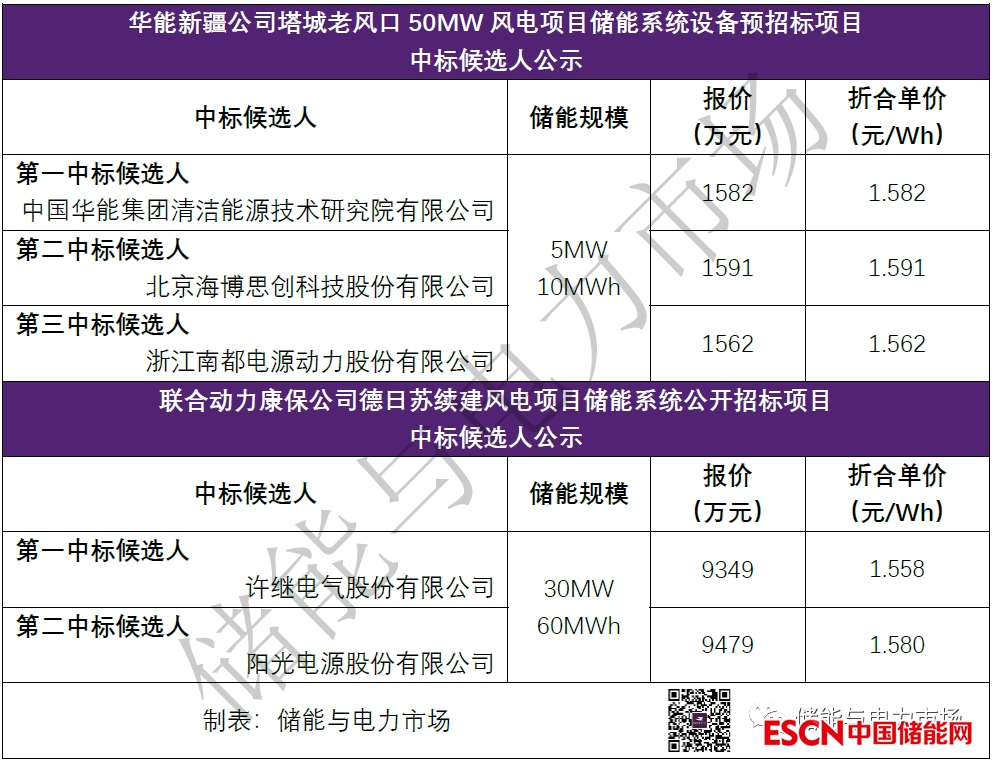 華能新疆公司塔城老風(fēng)口50MW風(fēng)電項(xiàng)目?jī)?chǔ)能系統(tǒng)設(shè)備預(yù)招標(biāo)項(xiàng)目,儲(chǔ)能規(guī)模5MW/10MWh,第一中標(biāo)候選人為中國(guó)華能集團(tuán)清潔能源技術(shù)研究院有限公司,投標(biāo)單價(jià)1.582元/Wh。