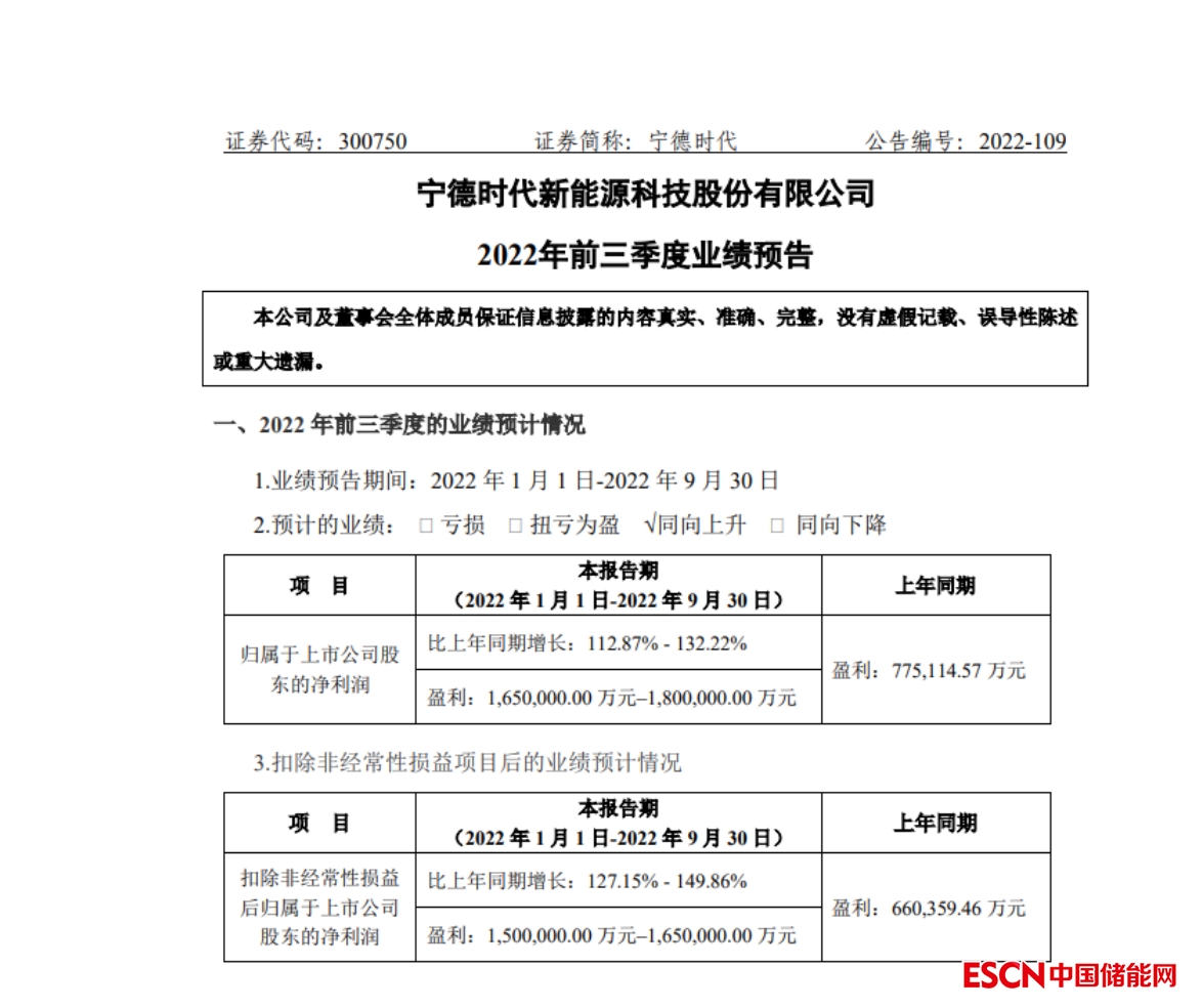 中國儲(chǔ)能網(wǎng)訊:10月10日晚間,寧德時(shí)代(SZ300750,股價(jià)392.86元,市值9588億元)發(fā)布2022年前三季度業(yè)績預(yù)告。業(yè)績預(yù)告顯示,寧德時(shí)代預(yù)計(jì)其2022年前三季度歸母凈利潤為165億~180億元,同比增長112.87%~132.22%。值得注意的是,這一數(shù)字已超過其2021年的歸母凈利潤(159.31億元)。
