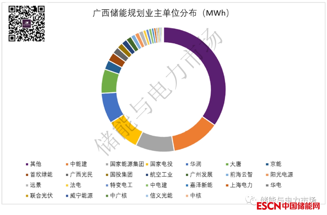 從競爭性配置的實際情況上看,風、光市場化項目均做到了15%-20%,儲能時長2小時的儲能配置。新能源驅(qū)動儲能發(fā)展在廣西十分明顯,儲能項目業(yè)主單位的分布情況也證明了這一情況。廣西的儲能項目實際買單方仍舊是新能源發(fā)電企業(yè)。