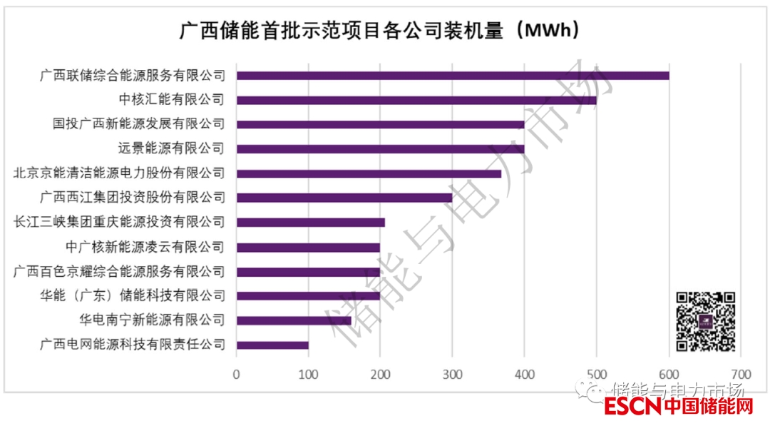 從項目列表上看,12個項目分屬12個不同的公司/集團,基本雨露均沾了。但從項目規(guī)模上看,廣西聯(lián)儲綜合能源服務(wù)有限公司的項目規(guī)模最大,為100MW/600MWh,占本次項目總規(guī)模的16.5%。