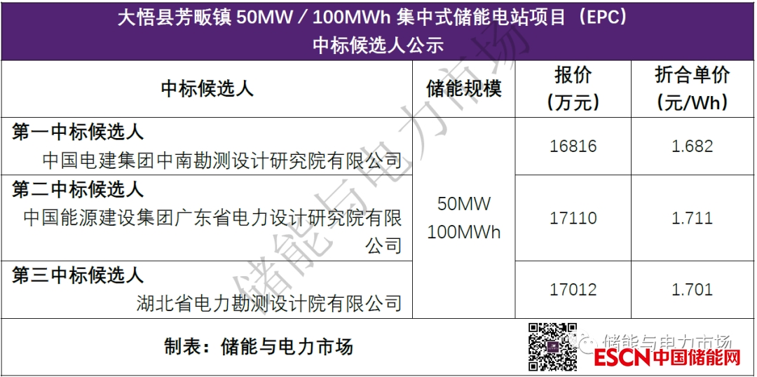 中國(guó)儲(chǔ)能網(wǎng)訊:近日,大悟縣芳畈鎮(zhèn)50MW/100MWh集中式儲(chǔ)能電站項(xiàng)目(EPC)中標(biāo)候選人公示發(fā)布,中國(guó)電建集團(tuán)中南勘測(cè)設(shè)計(jì)研究院有限公司以總報(bào)價(jià)16816萬(wàn)元,折合單價(jià)1.682元/Wh,成為第一中標(biāo)候選人。中標(biāo)候選人情況如下表。