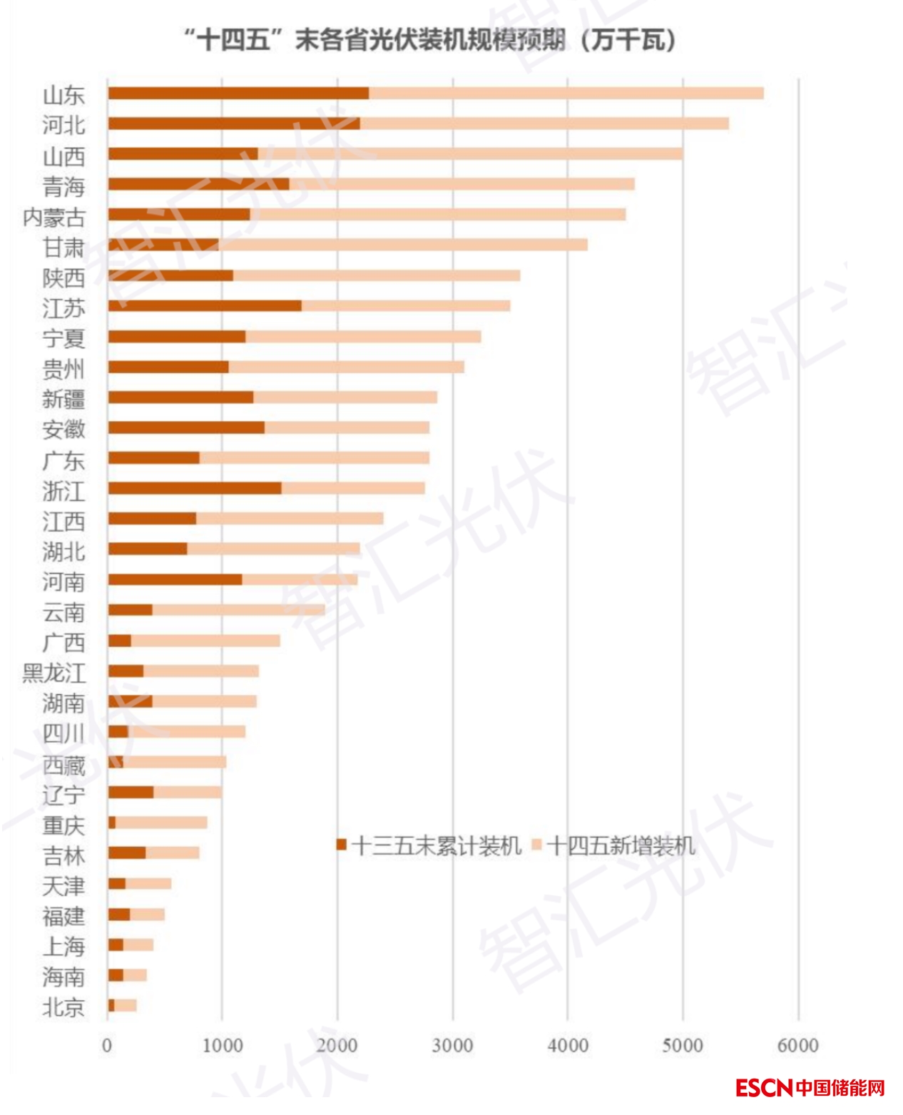 其中,山東省十三五末為2272萬千瓦,全國第一;十四五期間,預(yù)期新增3428萬千瓦,累計達到5700萬千瓦,將仍然為全國光伏第一裝機大?。?