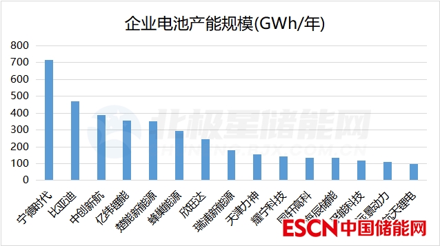 現(xiàn)階段,產(chǎn)能超100GWh以上的企業(yè)共有15家,總產(chǎn)能達(dá)到3909GWh、占據(jù)近八成的市場份額。具體包括:寧德時(shí)代、比亞迪、中創(chuàng)新航、億緯鋰能、楚能新能源、蜂巢能源、欣旺達(dá)、瑞浦新能源、天津力神、耀寧科技、國軒高科、海辰儲(chǔ)能、孚能科技、遠(yuǎn)景動(dòng)力、航天鋰電。