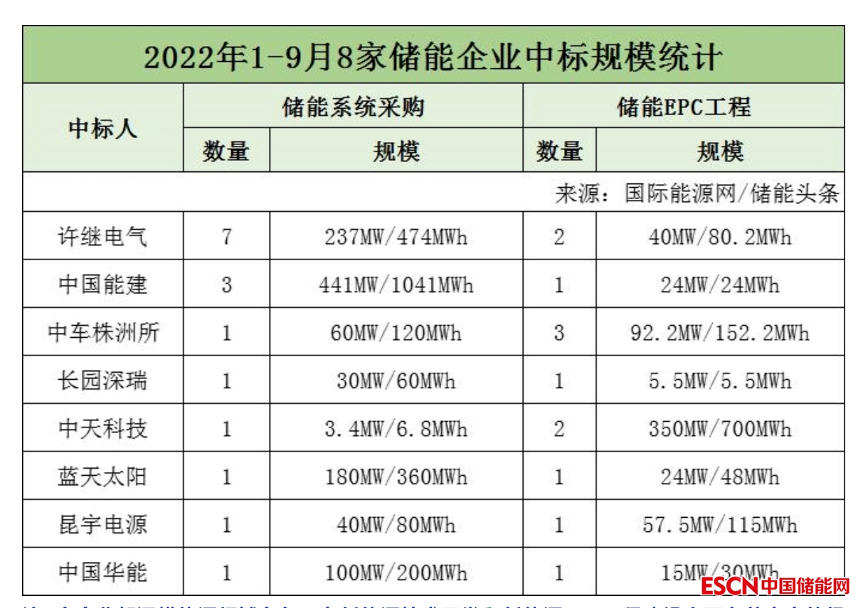 2022年前三季度國家能源集團共有2個儲能EPC工程項目開標,項目總規(guī)模為48MW/96MWh。