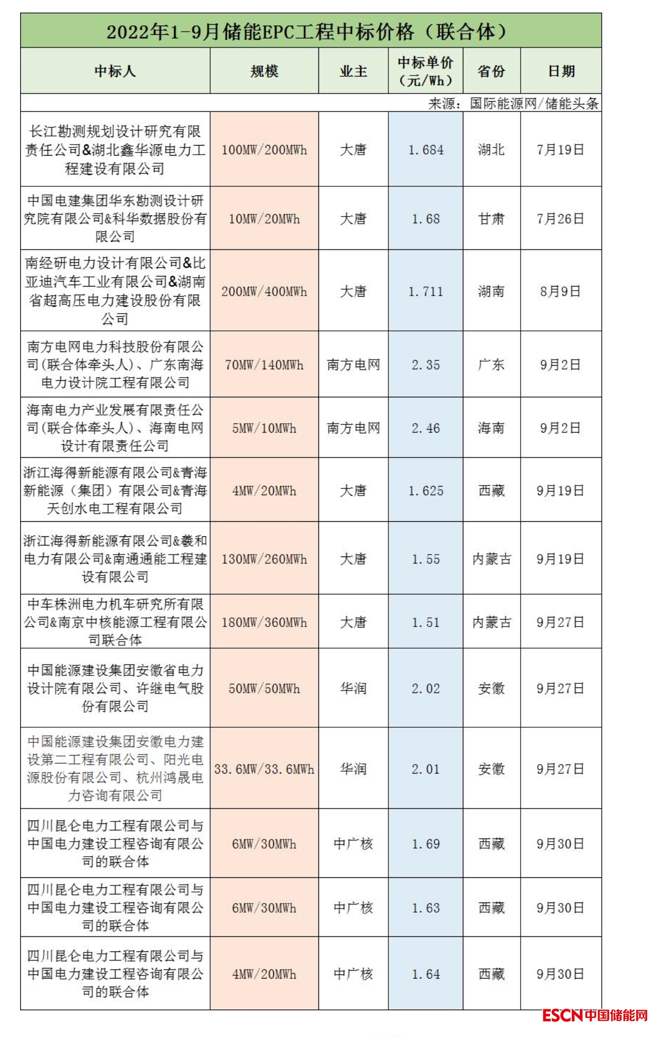 在聯(lián)合體方面,有13個儲能采購項目聯(lián)合體中標,項目來自大唐、華潤、南方電網(wǎng)、中廣核,項目規(guī)模798.6MW/1603.6MWh,中標價格在1.51~2.46元/Wh。