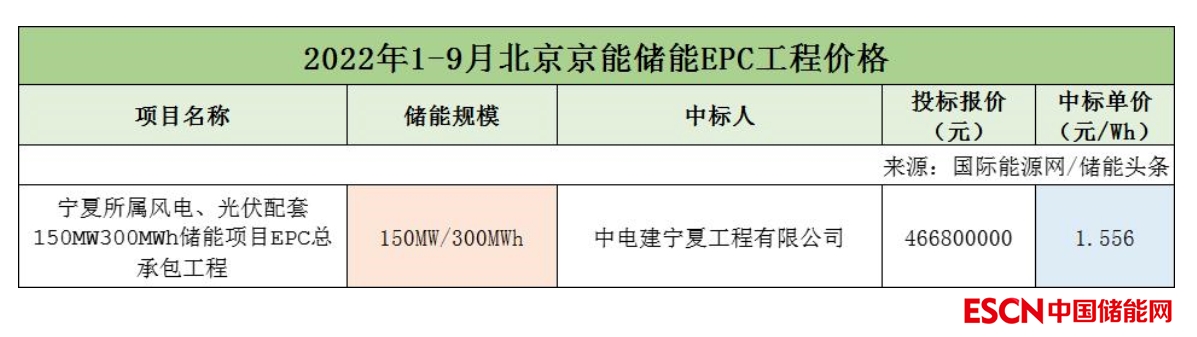 2022年前三季度北京京能僅有1個儲能EPC工程項目開標,項目總規(guī)模為150MW/300MWh。