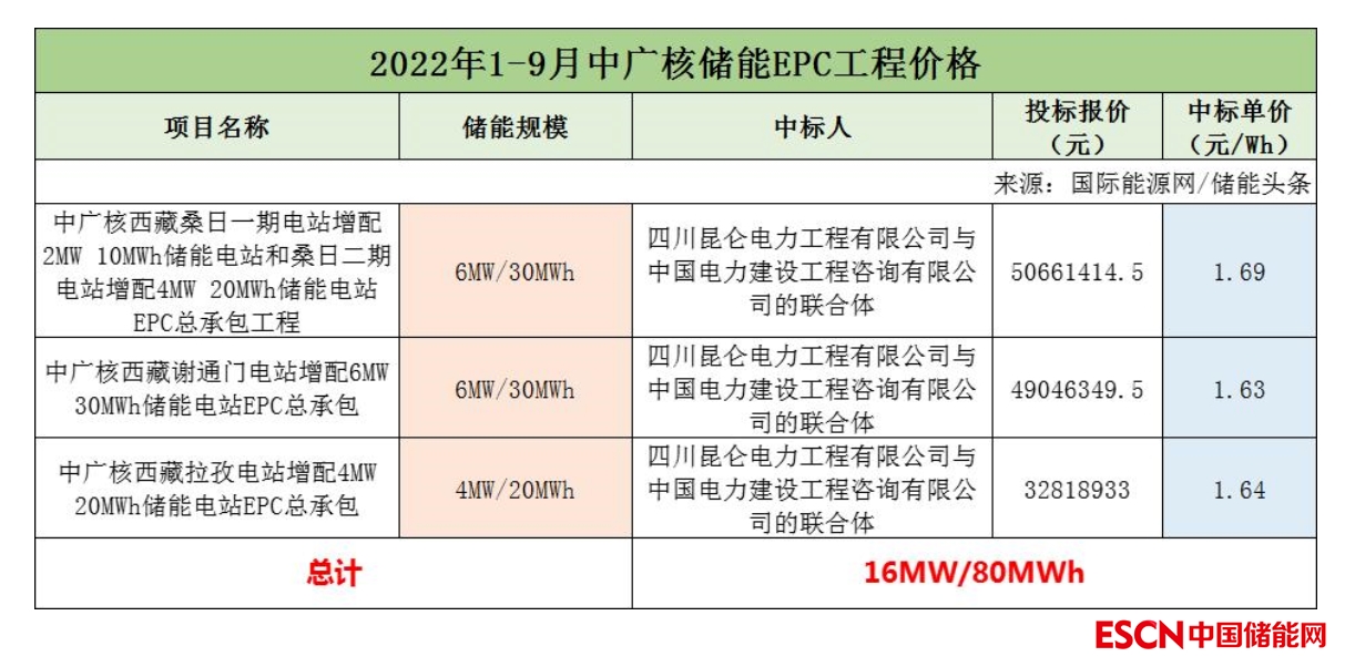 其中,中廣核3個儲能EPC項目中標人均為四川昆侖電力工程有限公司與中國電力建設工程咨詢有限公司的聯(lián)合體,報價在1.63-1.69元/Wh。