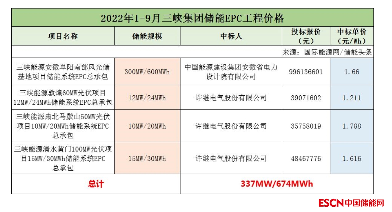 2022年前三季度三峽集團共有4個儲能EPC工程項目開標,項目總規(guī)模為337MW/674MWh。