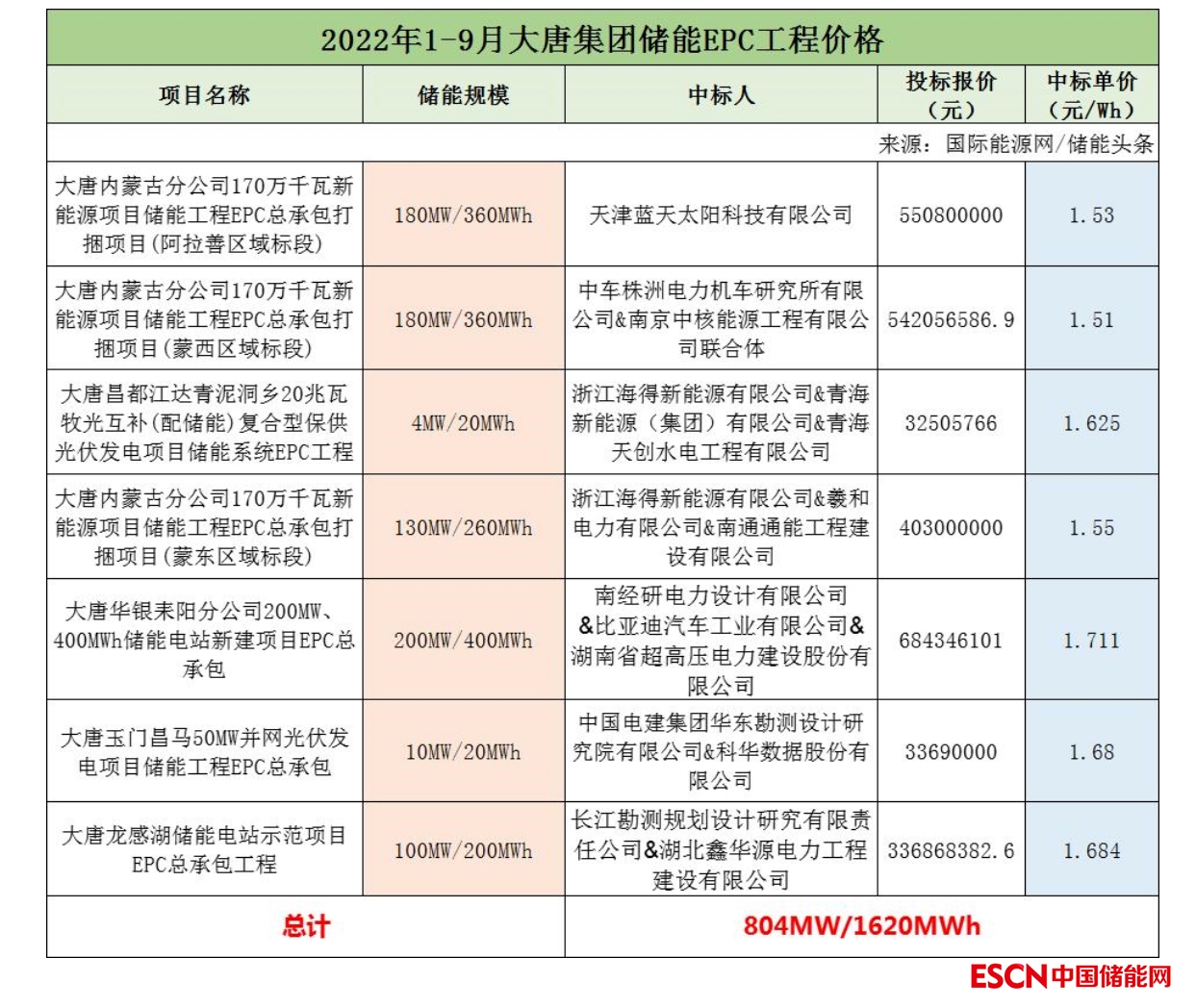 2022年前三季度大唐集團共有7個儲能EPC工程項目開標,項目總規(guī)模為804MW/1620MWh。