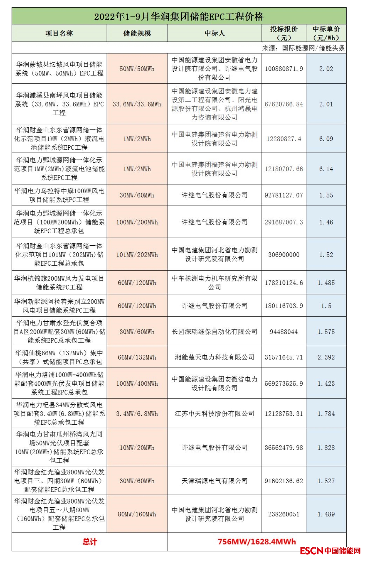 2022年前三季度華潤集團共有16個儲能EPC工程項目開標,項目總規(guī)模為756MW/1628.4MWh。