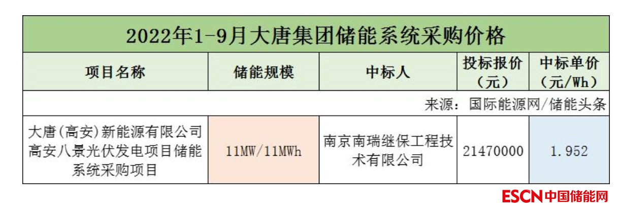 該項目為大唐(高安)新能源有限公司高安八景光伏發(fā)電項目儲能系統(tǒng)采購項目,儲能規(guī)模11MW/11MWh,中標人為南京南瑞繼保工程技術有限公司,投標報價21470000元,折合單價為1.952元/Wh。