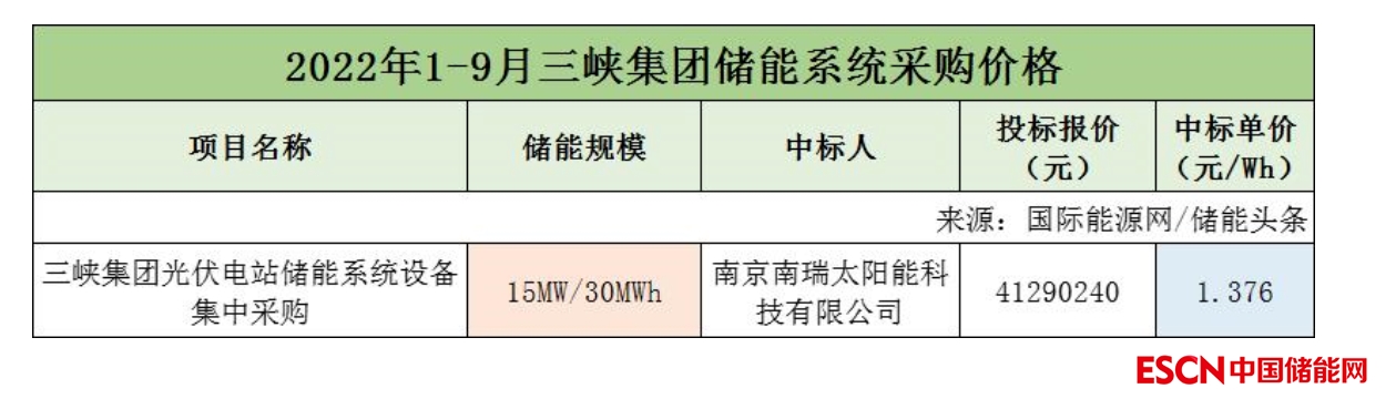 該項目為三峽集團光伏電站儲能系統(tǒng)設備集中采購項目,儲能規(guī)模15MW/30MWh,中標人為南京南瑞太陽能科技有限公司,投標報價41290240元,折合單價為1.376元/Wh。