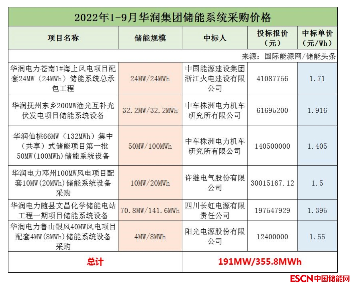2022年前三季度華潤集團共有6個儲能采購招標項目開標,項目總規(guī)模為191MW/355.8MWh。