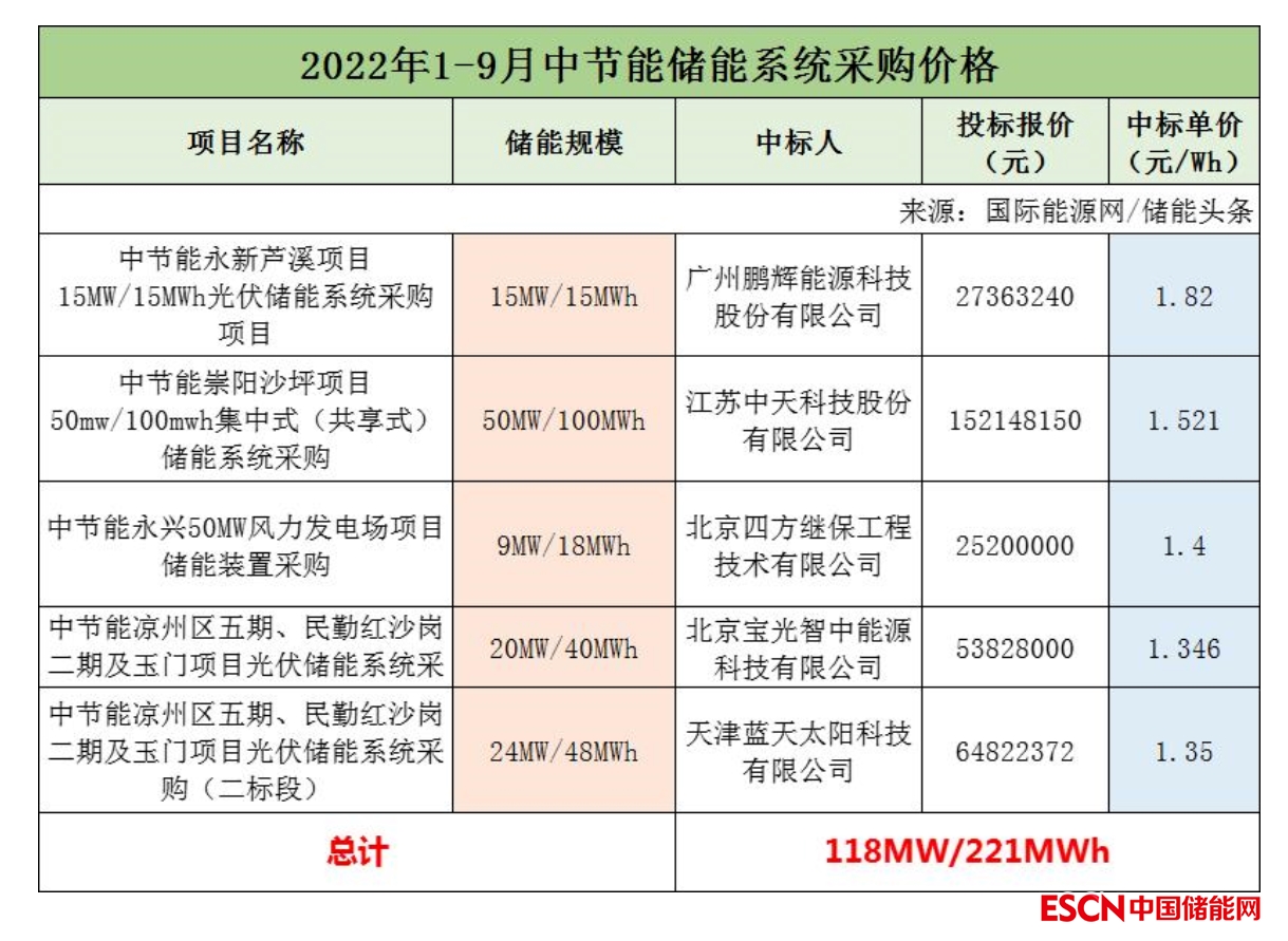 2022年前三季度中節(jié)能共有5個儲能采購招標項目開標,項目總規(guī)模為118MW/221MWh。