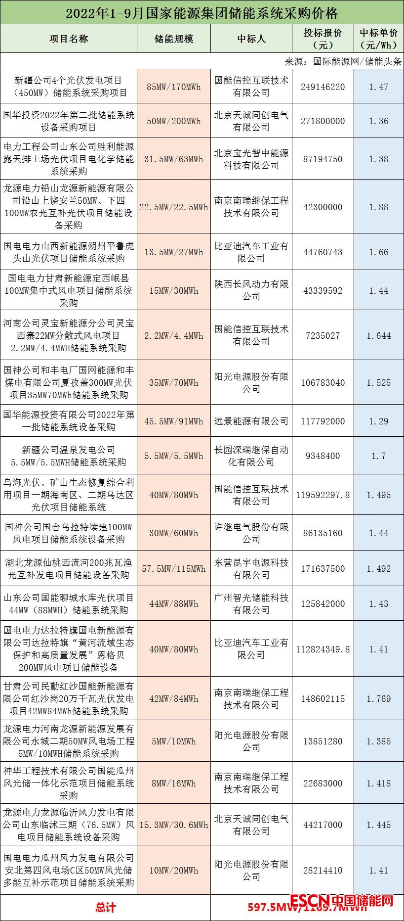 2022年前三季度國家能源集團共有20個儲能采購招標項目開標,項目總規(guī)模為597.5MW/1169.7MWh。
