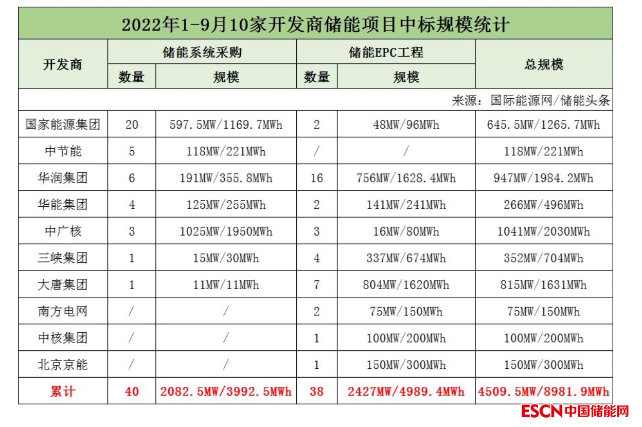 2022年前三季度華能集團共有4個儲能采購招標項目開標,項目總規(guī)模為125MW/255MWh。