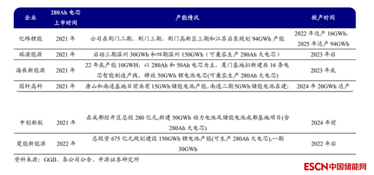 也正是在這種情況下,280Ah電芯已成為電池廠商的布局重點(diǎn)之一。據(jù)GGII不完全統(tǒng)計(jì),寧德時(shí)代、億緯鋰能、中創(chuàng)新航、國(guó)軒高科等11家公司已有相關(guān)擴(kuò)產(chǎn)計(jì)劃。