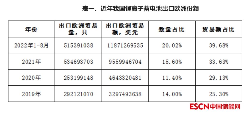 一、歐洲一直是我國鋰離子電池產(chǎn)品出口的主要目的地,2022年從貿(mào)易額上看已成為我國鋰離子電池產(chǎn)品出口的最大目的地。我國海關(guān)數(shù)據(jù)顯示,2019年–2021年,我國鋰離子蓄電池出口到歐洲的數(shù)量占出口總量的15%左右;出口額逐年增加,占比在30%左右。2022年1–8月,貿(mào)易量和貿(mào)易額占比分別提高到20%和40%,與歐洲的貿(mào)易量僅次于亞洲地區(qū),貿(mào)易額則排名第一。歐洲已成為我國鋰離子電池出口的最大目的地,對我國鋰離子電池企業(yè)來說是非常重要的市場。
