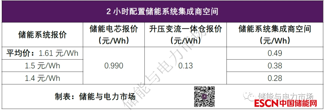 以本項(xiàng)目中電芯平均價(jià)為參考,刨去儲(chǔ)能系統(tǒng)電芯+升壓變流一體倉(cāng)總成本1.120元/Wh(0.99+0.13),在不同的報(bào)價(jià)水平下,儲(chǔ)能集成商的實(shí)際空間如下表。
