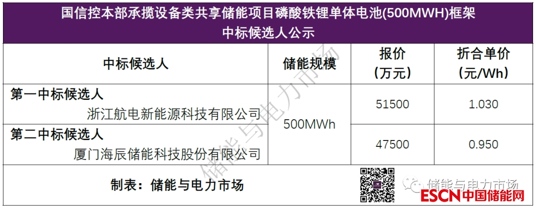 中國(guó)儲(chǔ)能網(wǎng)訊:近日《國(guó)信控本部承攬?jiān)O(shè)備類共享儲(chǔ)能項(xiàng)目磷酸鐵鋰單體電池(500MWH)框架中標(biāo)候選人公示》對(duì)外發(fā)布,浙江航電新能源科技有限公司以總報(bào)價(jià)51500萬(wàn)元,折合單價(jià)1.03元/Wh,成為第一中標(biāo)候選人。中標(biāo)候選人情況如下表所示。