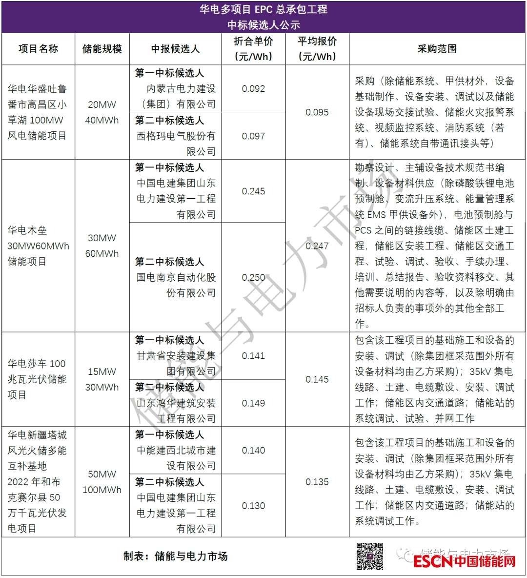 中國(guó)儲(chǔ)能網(wǎng)訊:近日華電新疆多個(gè)項(xiàng)目發(fā)布了EPC工程中標(biāo)公告(不包含儲(chǔ)能設(shè)備采購(gòu)),中標(biāo)平均價(jià)位于0.095-0.247元/Wh之間。如下表所示。