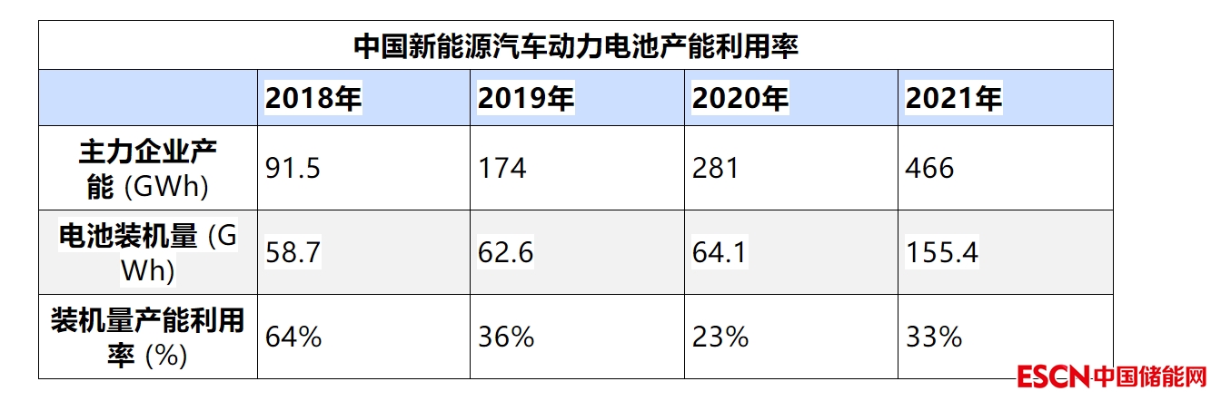 目前,中國新能源汽車動力電池產(chǎn)能利用率偏低,2021年主力動力電池企業(yè)產(chǎn)能在年末達到466GWh,但裝機量需求155GWh,產(chǎn)能利用率只有33%。