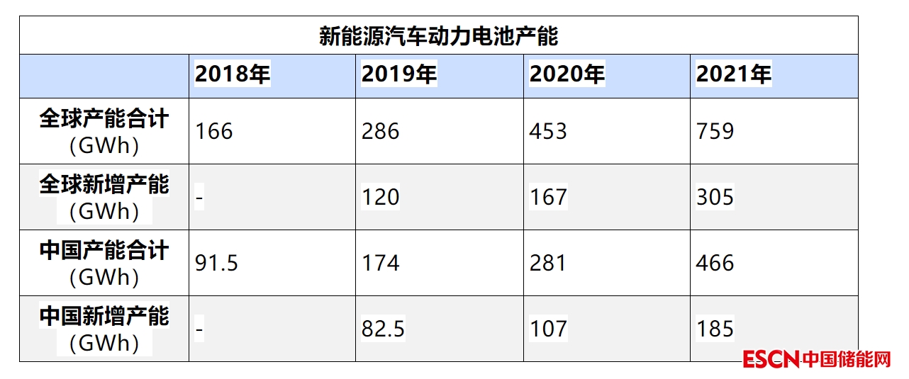 近幾年,在世界新能源汽車高增長拉動下,全球新能源汽車動力電池企業(yè)的產(chǎn)銷規(guī)模持續(xù)高增長,拉動產(chǎn)能擴張相對較快。2018年全球新能源汽車動力電池主力企業(yè)產(chǎn)能達到166G瓦時,2021年達到759G瓦時,以年均70%的增速高增長。