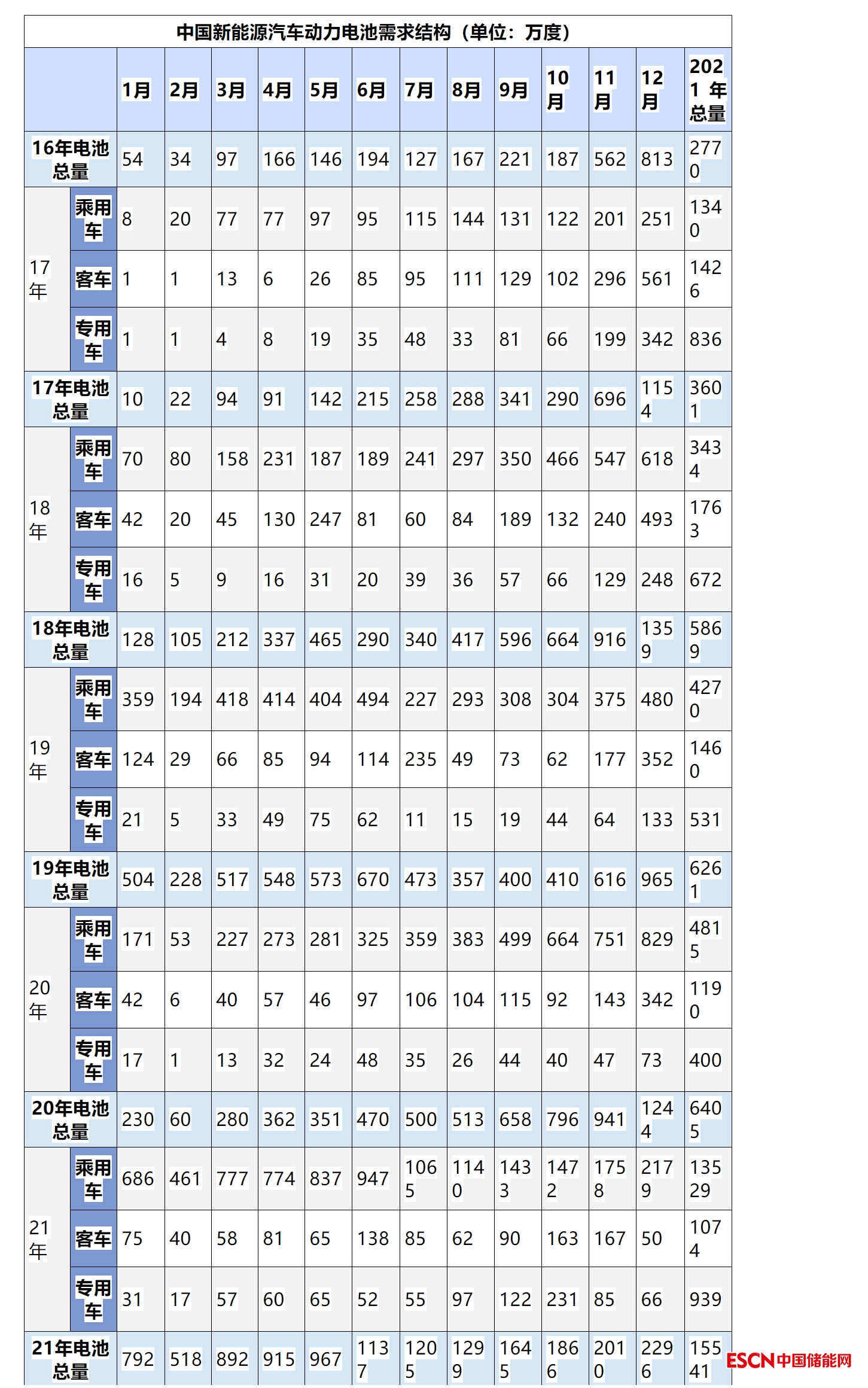 新能源汽車需求出現(xiàn)從客車為主的拉動轉(zhuǎn)移到乘用車為主的變化。2021年動力電池需求15542萬度,大幅好于2020年的動力電池6405萬度需求。隨著2019年新能源補貼退坡前后的干擾因素消失,2020年7-12月和2021年的的動力電池需求相對較強。