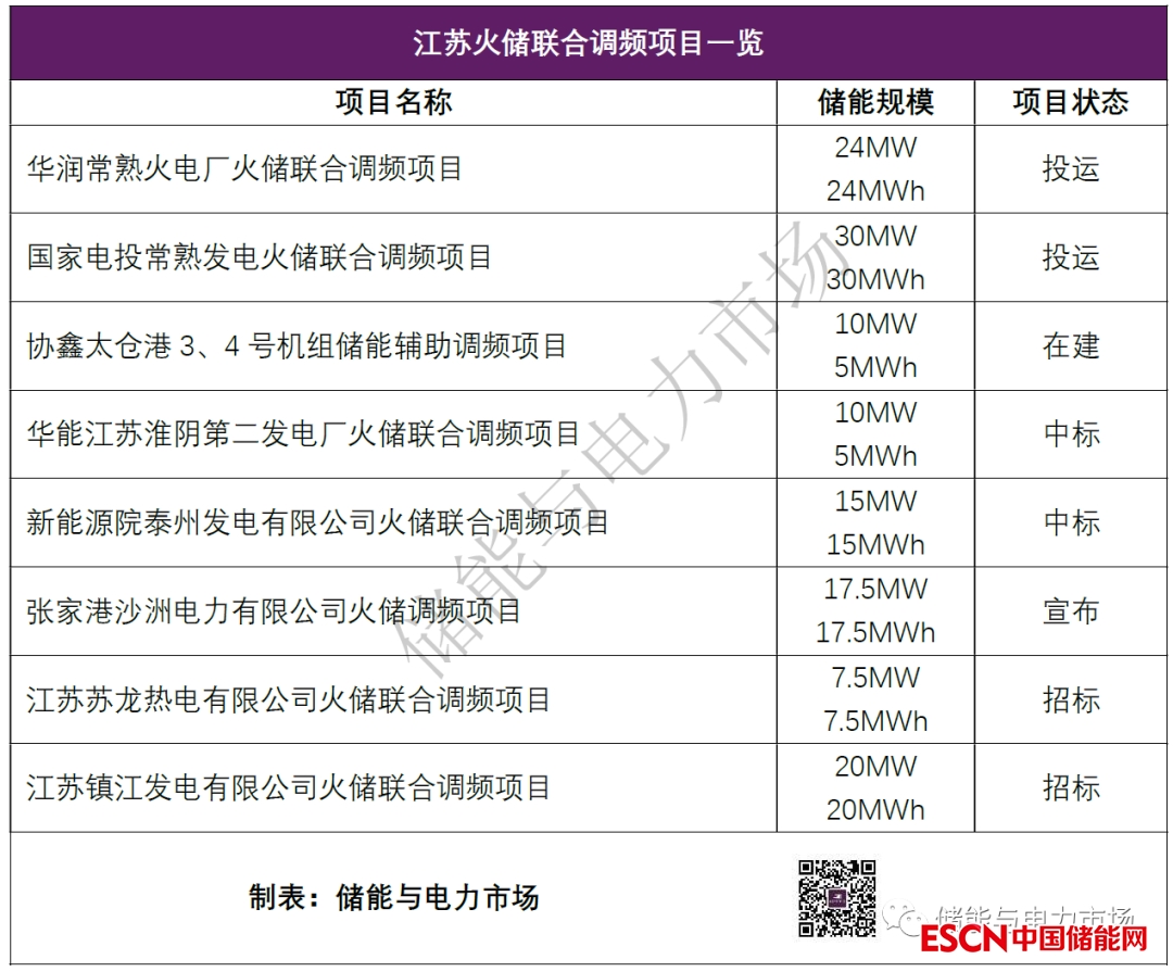 截至目前,江蘇省的火儲(chǔ)聯(lián)合調(diào)頻項(xiàng)目已增至8個(gè),總計(jì)儲(chǔ)能容量134MW/124MWh。如下表所示。