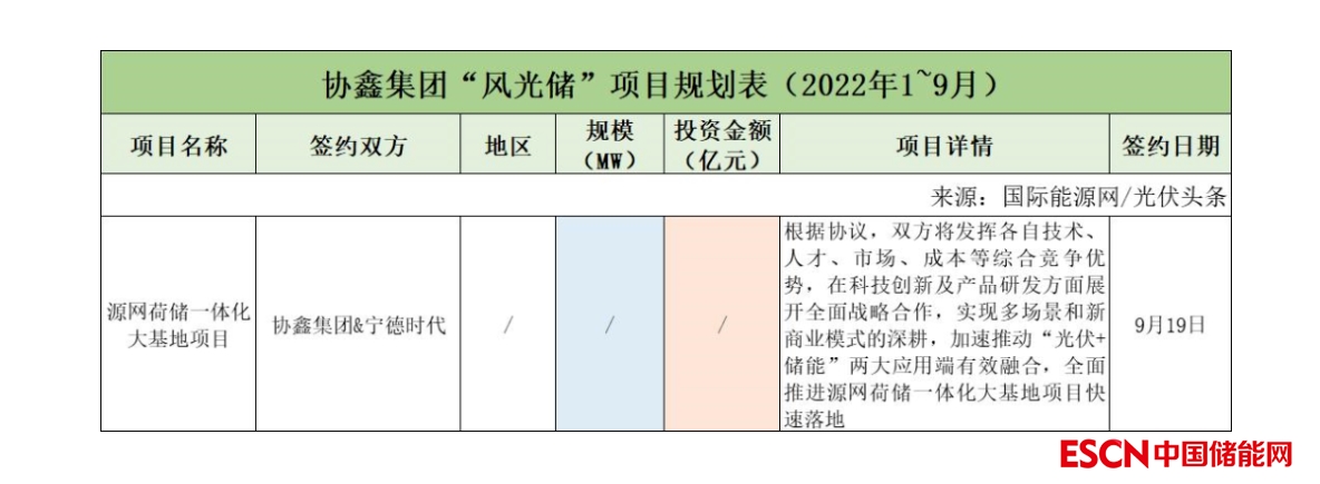 截至2022年9月30日,協(xié)鑫集團(tuán)共簽約(規(guī)劃)1個(gè)風(fēng)光儲(chǔ)項(xiàng)目,該項(xiàng)目?jī)H簽署了合作協(xié)議。